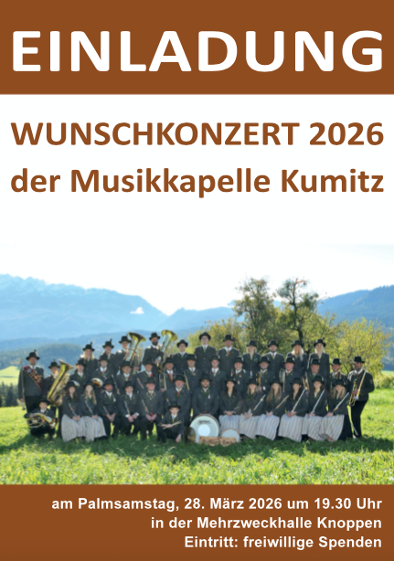 9. März 2026 Wunschkonzert der Musikkapelle Kumitz Die Musikkapelle Kumitz ladet am Palmsamstag, 28.03.2026 um 19:30 Uhr in der Mehrzweckhalle Knoppen zum Wunschkonzert ein. Musikalische Gäste sind die “Hollerschnapszuzler”. Als Moderator wird Peter Gillesberger durch das Programm führen.