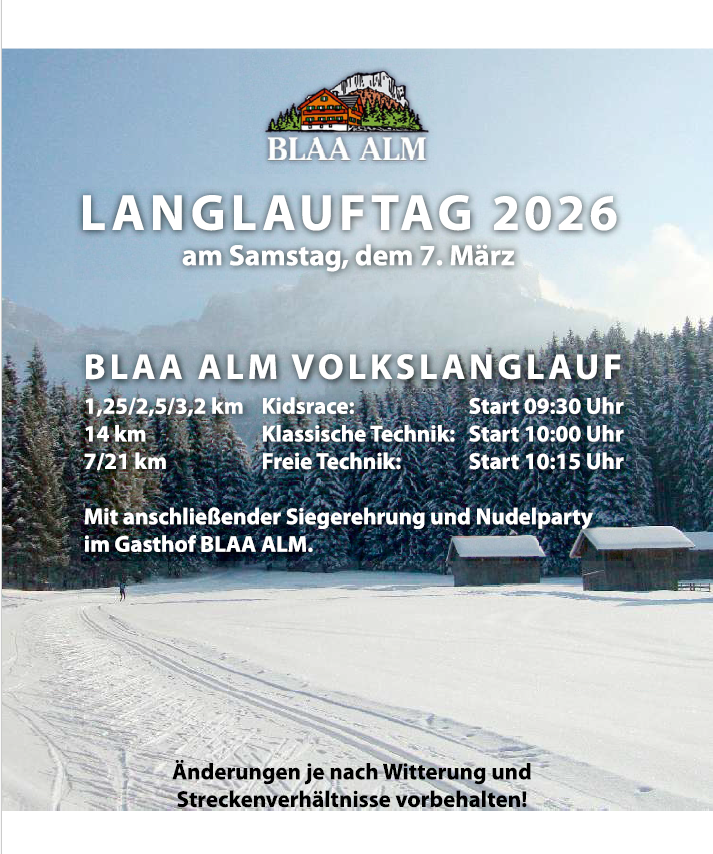 3. März 2026 Blaa Alm Langlauftag am Samstag, 07. März 2026 Wir werden versuchen das Rennen am Samstag, 07. März 2026 durchzubringen. Die Strecken müssen wir heuer auf Grund des Schneemangels und der warmen Temperaturen etwas abändern bzw. laut Ausschreibung kürzen….