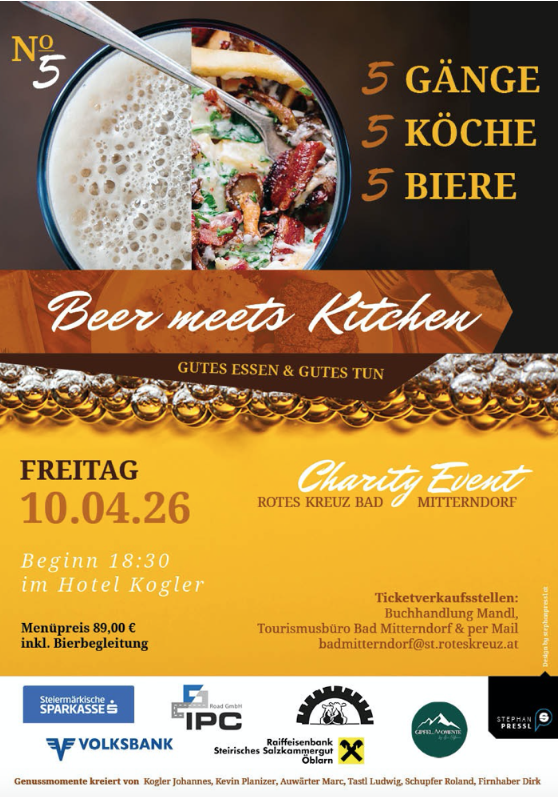 1. April 2026 Beer meets Kitchen, Rotes Kreuz Bad Mitterndorf Gutes Essen, Gutes Tun. Unter dem Motto 5 Gänge · 5 Köche · 5 Biere findet am 10.04.2026 das Charité- Event Beer meets Kitchen statt. Bei der 5 Auflage, die beim Hotel Kogler in Bad…