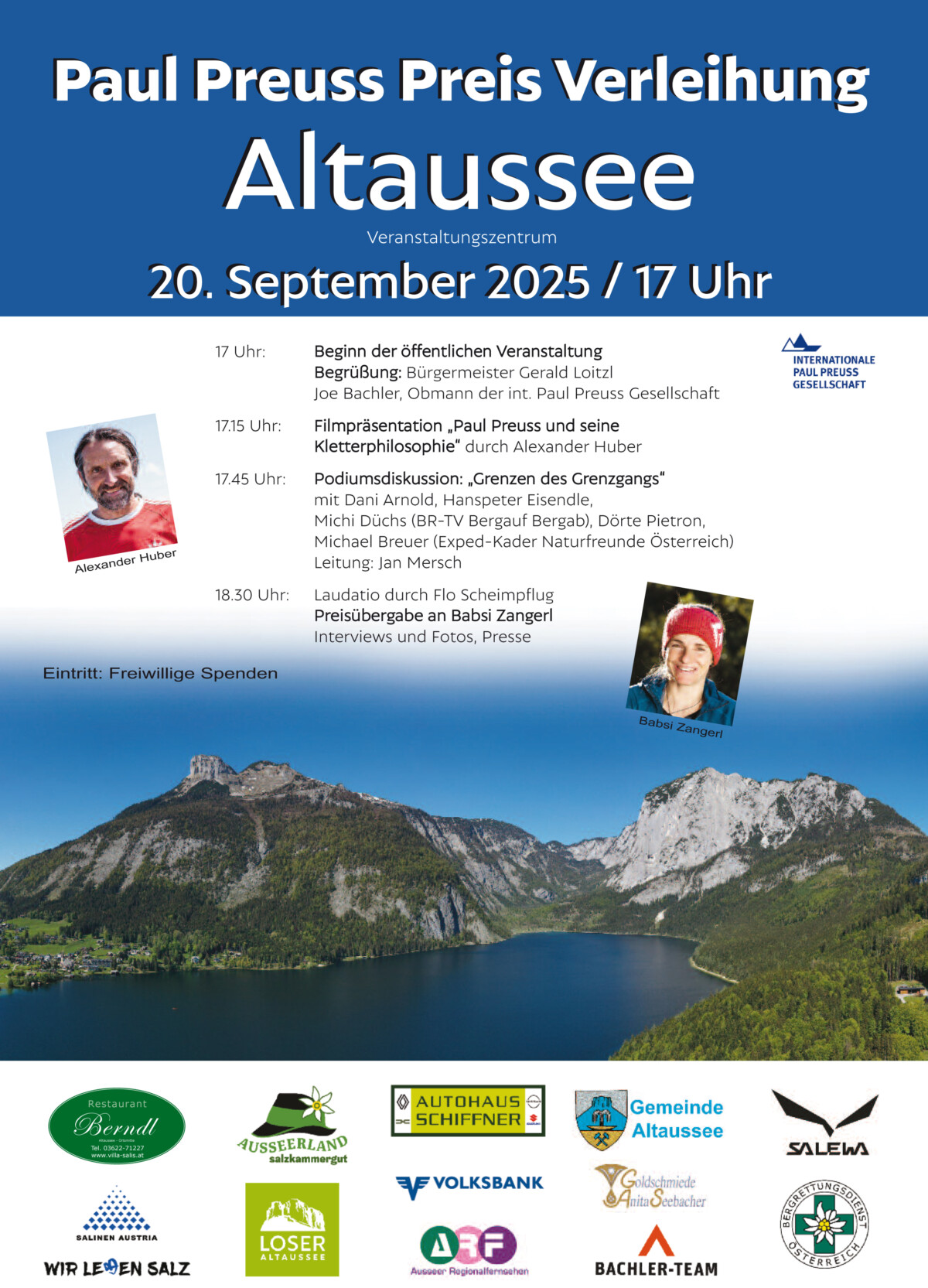 Am 20. September findet im neuen Veranstaltungszentrum Altaussee die 13. Paul Preuss Preis Verleihung statt. Die in Bad Aussee von Lutz Maurer und Hans Fuchs gegründete Paul Preuss Gesellschaft ist die Vereinigung von Weltklasse Alpinisten und internationalen Alpinjournalisten. Der daraus entstandene Paul Preuss Preis wird jährlich an herausragende Alpinisten verliehen, die sich im Laufe ihrer gesamten bergsportlichen Entwicklung nicht nur durch herausragende Leistungen im Gebirge, sondern auch im Sinne der Philosophie Paul Preuss’ mit dem Verzicht auf technische Aufstiegshilfen dem freien Klettern verschrieben und besonders ausgezeichnet haben.