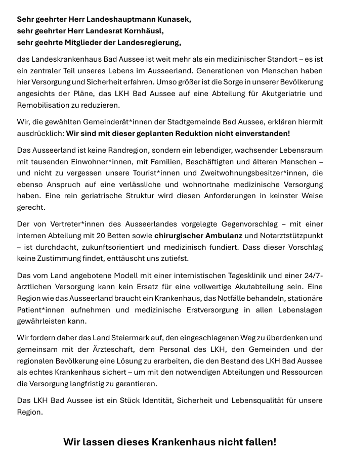 1. Den Erhalt des Landeskrankenhauses Bad Aussee in seiner derzeitigen Form.