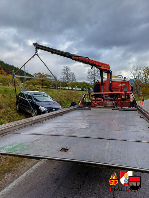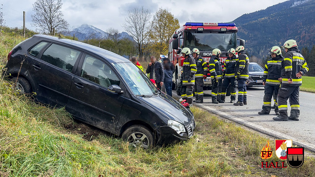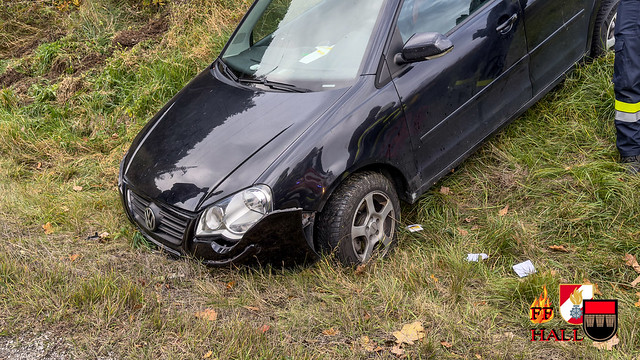 Lage beim Eintreffen: Ein PKW war aus ungeklärter Ursache von der Fahrbahn abgekommen und gegen eine Böschung geprallt. Eine Person wurde dabei verletzt.