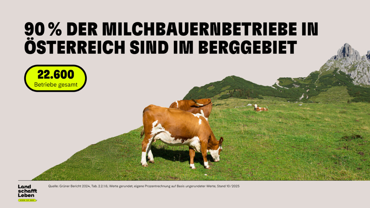 Gemeinsam mit Irland produziert Österreich die klimafreundlichste Milch der EU und ist damit auch global vorn dabei. Das hat vor allem drei Gründe: Die heimischen Milchbäuerinnen und -bauern setzen auf einen hohen Grünlandanteil in der Fütterung und produzieren einen großen Teil ihres Futters selbst, anstatt sie aus Ländern wie Südamerika zu beziehen. Dadurch entstehen deutlich weniger Emissionen durch Landnutzungsänderungen, wie das etwa der Fall ist, wenn Regenwaldflächen zugunsten der Sojaproduktion gerodet werden. Die heimische Milchwirtschaft setzt außerdem stark auf die Zweinutzungsrasse „Fleckvieh”. Diese Rasse zeigt sowohl bei Milch als auch bei Fleisch gute Leistungen, wodurch sich die Emissionen im Gesamtsystem auf eine größere Produktmenge verteilen. Zudem leben die Kühe hierzulande durchschnittlich länger als in vielen anderen Ländern, dadurch entstehen ebenfalls weniger Emissionen pro Liter Milch, den die Kuh gibt.