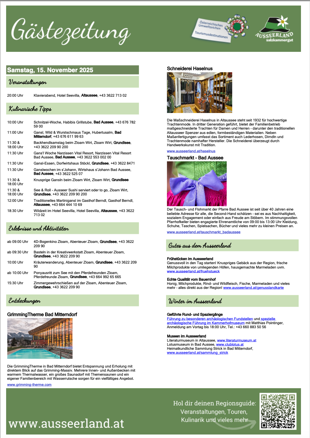 Gästezeitung des TVB Ausseerland Salzkammergut für Samstag, 15. November 2025