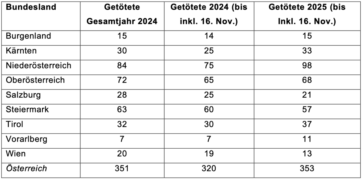 Insgesamt sind auf Österreichs Straßen heuer bereits mindestens 353 Menschen ums Leben (Stand 16.11.2025). Mindestens deshalb, da es noch zu statistischen Nachmeldungen kommen kann – etwa, wenn Schwerverletzte später im Spital sterben. Aktuell gibt es aber bereits gesichert mehr Verkehrstote als im gesamten Vorjahr (351). Das heurige Ziel der österreichischen Verkehrssicherheitsstrategie – weniger als 310 Getötete – wird zudem klar verfehlt. Bis Jahresende dürfte sich die Zahl laut KFV-Prognosen sogar auf 382 Getötete summieren.