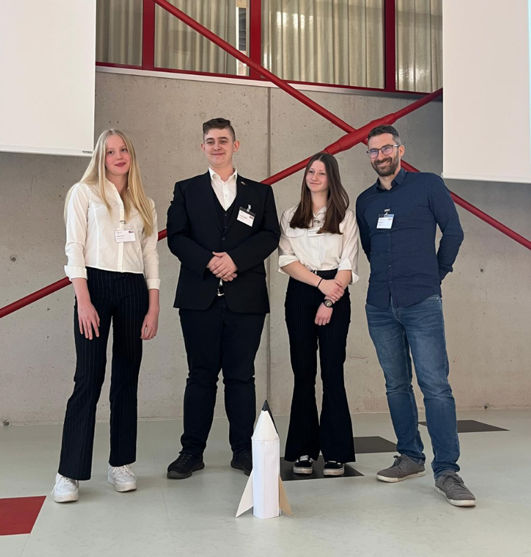 Physiklehrer Mag. Stefan Welzl präsentierte gemeinsam mit den drei teilnehmenden Schüler:innen Alycia Elser, Maria Berger und Frederik Köberl zentrale Ergebnisse des Projekts: Raketenbau, Mondbeobachtungen und wissenschaftliche Experimente zu realen Raumfahrt-Themen wie Surface Operations, Health & Safety und Mobility.