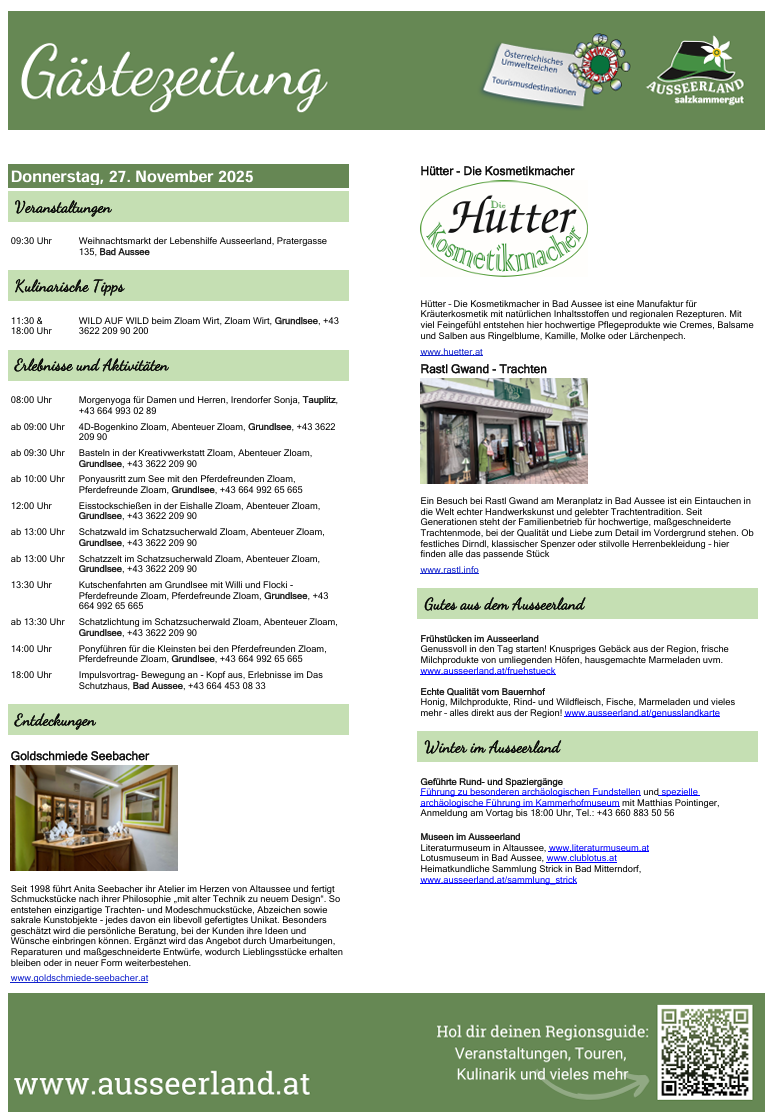 Gästezeitung des TVB Ausseerland Salzkammergut für Donnerstag, 27.11.2025