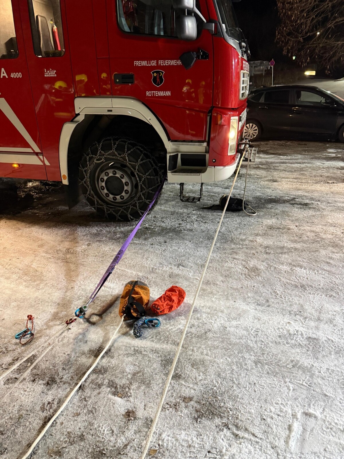 Bei der Übung wurde ein in die Palten gestürzter Pkw gesichert und eine eingeklemmte Person über den Kofferraum gerettet. Die Rettung der Person erfolgte mittels Schleif-/Korbtrage, die Fahrzeugbergung wurde mit Greifzug und Seilwinde durchgeführt. Doppelter Brandschutz, Verkehrsabsicherung und das Ausleuchten der Unfallstelle rundeten das Szenario ab.