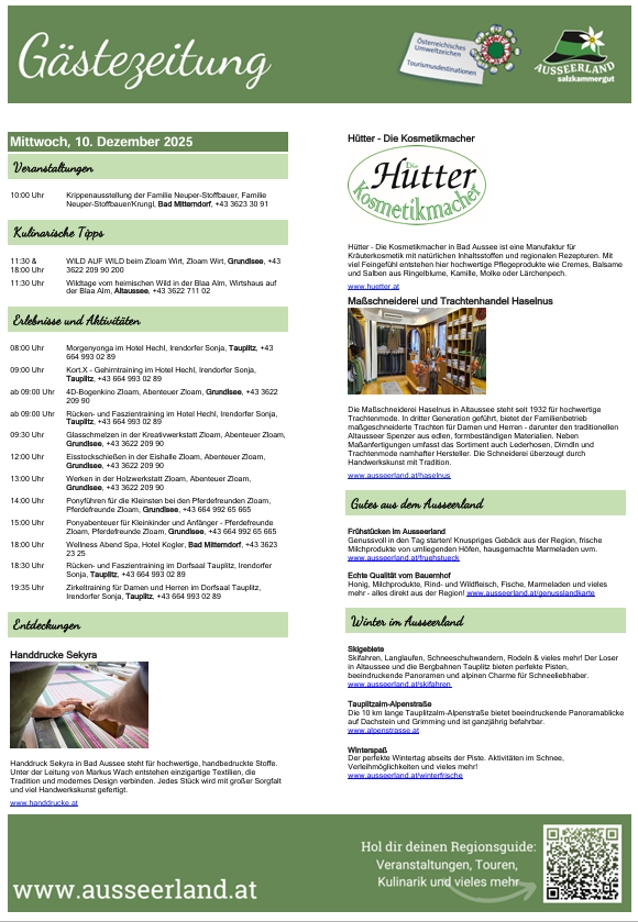 Gekocht wird nach alten Steirischen und Ausseer Rezepten. Wir servieren Ihnen Spezialitäten wie herzhafte Kasnocken und süße Pfandl, die berühmte Cremeschnitte und viele regionale Schmankerl. Durchgehend warme Küche.