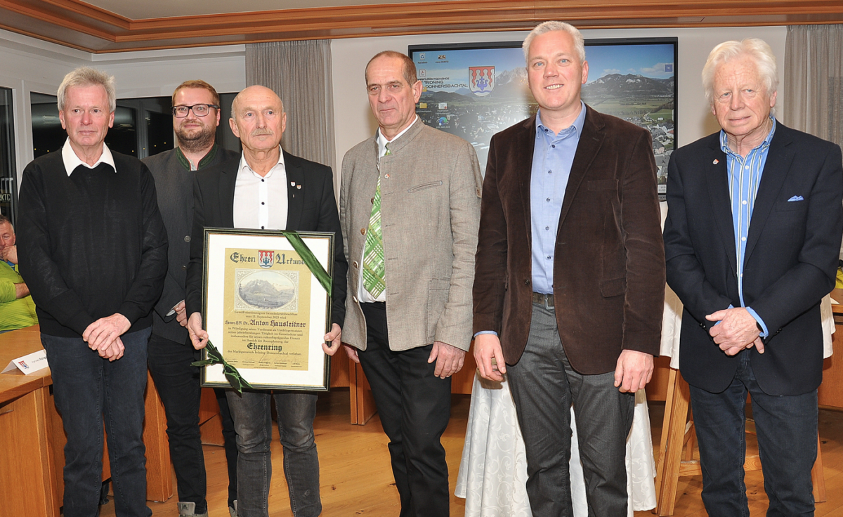 Als höchste Auszeichnung erhielt Hofrat Dr. Anton Hausleitner den Ehrenring der Marktgemeinde Irdning-Donnersbachtal. Er war insgesamt 25 Jahre Mitglied des Gemeinderates und davon 15 Jahre im Gemeindevorstand tätig. In dieser Zeit hat er zahlreiche Großprojekte maßgeblich mitgestaltet und die Gemeinde auch durch herausfordernde Phasen begleitet. Besonderer Dank galt seinem großen Einsatz im Bereich der Flächenwidmung und Raumplanung.