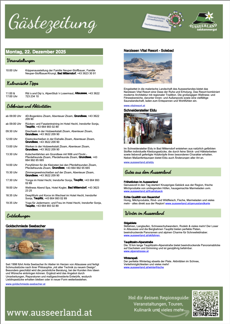 Eingebettet in die malerische Landschaft des Ausseerlandes bietet das Narzissen Vital Resort eine Oase der Ruhe und Erholung. Das Resort kombiniert moderne Architektur mit regionaler Tradition. Die großzügigen Wellness- und Fitnessbereiche, darunter Innen- und Außenpools sowie eine vielfältige Saunalandschaft, laden zum Entspannen und Wohlfühlen ein.