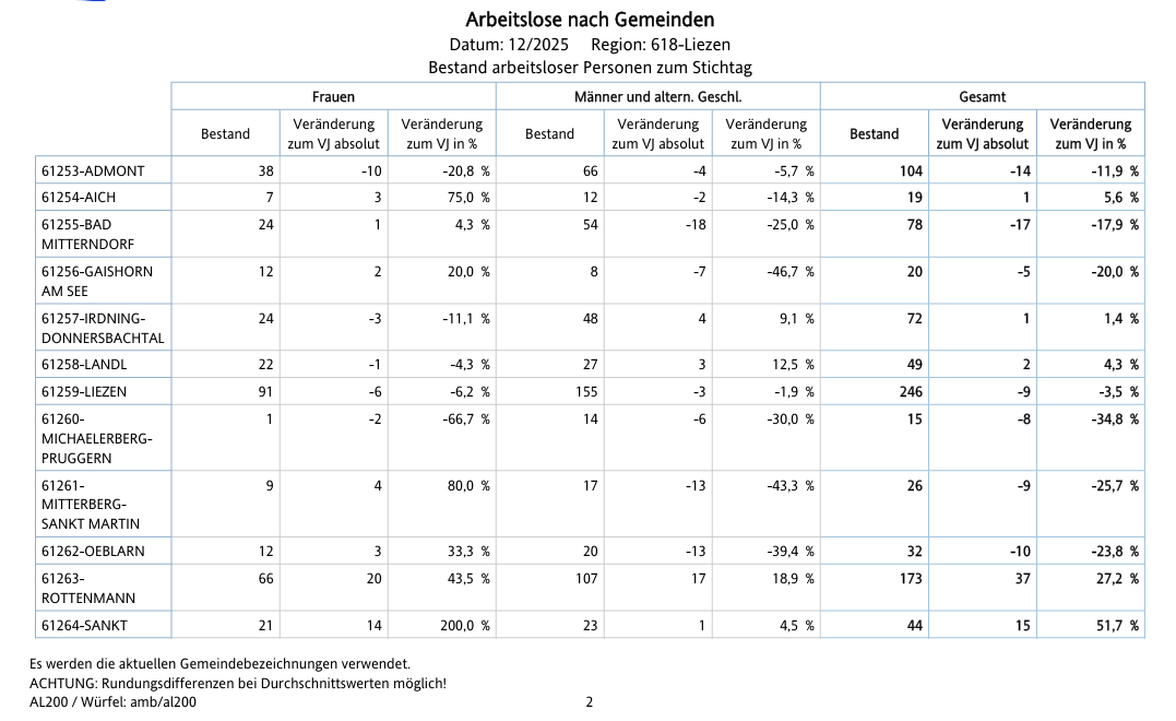 Mit Ende Dezember 2025 sind beim AMS Liezen 1.697 Personen arbeitslos gemeldet.