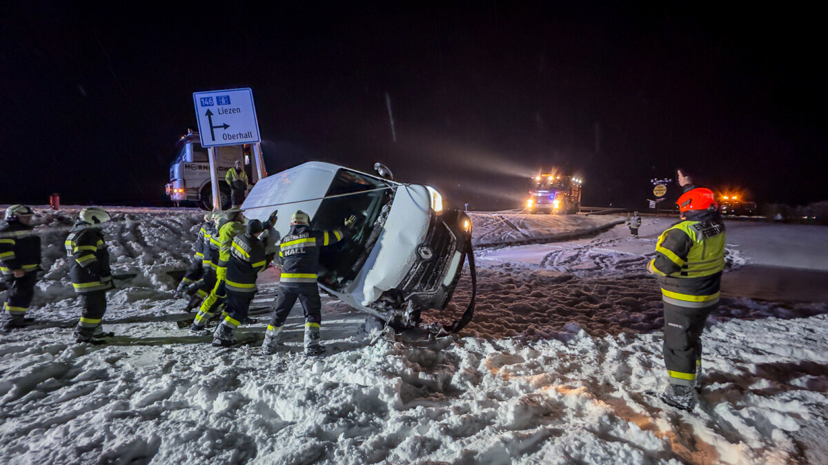 Eine Person konnte sich selbstständig aus dem Fahrzeug befreien. Die winterlichen Straßenverhältnisse und der starke Schneefall erschwerten die Lage vor Ort.