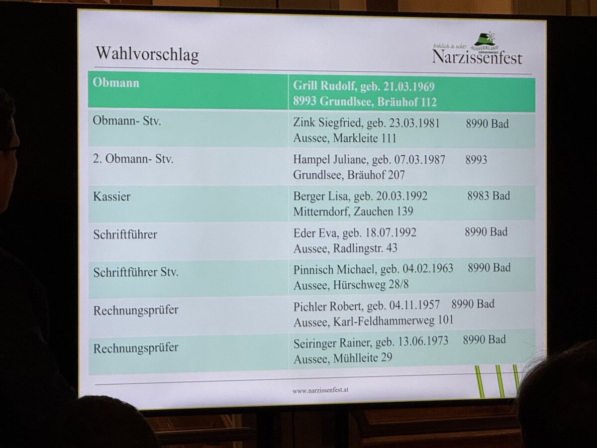 Für die heuer anstehenden Neuwahlen wurde der ehemalige Obmann des Narzissenfestvereines Christian Seiringer gebeten, den Vorsitz zu übernehmen und die Wahl durchzuführen. Da es nur einen Wahlvorschlag des Vorstandes gab, wurde dieser verlesen.