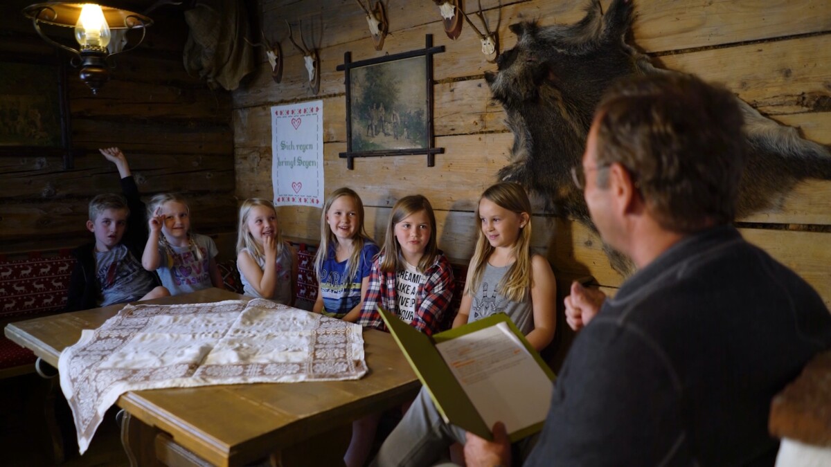 Georg Pliem als Sagenerzähler, Felix Gottwald, Gerhard Pilz und die Unterdechler Ski-Kids.