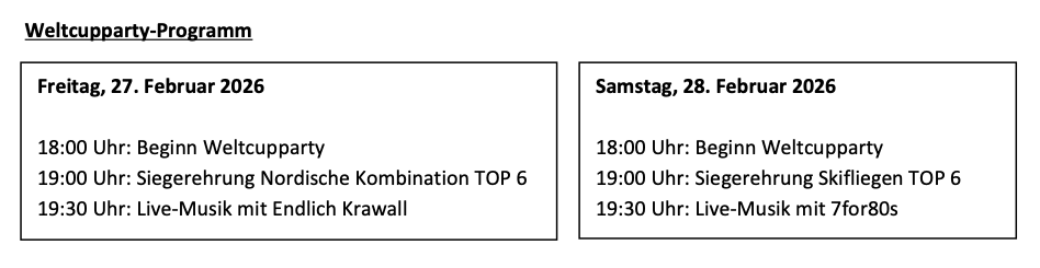 Von 27. Februar bis 1. März 2026 steht Bad Mitterndorf ganz im Zeichen des Skifliegens am Kulm. Nachdem die besten Skispringer und Nordischen Kombinierer der Welt über den Kulm-Hang segeln und sportliche Höchstleistungen zeigen, wartet im Ort das nächste Highlight: die große Weltcupparty im Herzen von Bad Mitterndorf.