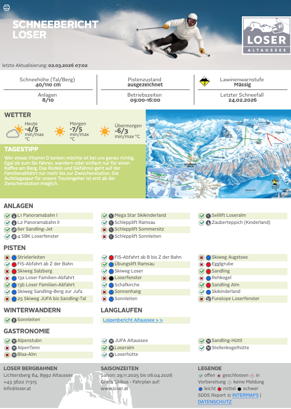 Am Loser erstreckt sich eines der wichtigsten Skigebiete des Ausseerlandes, insgesamt über 1.000 Höhenmeter. Die Abfahrt führt direkt an der Loserhütte (1.498 m), dem zweiten Gastronomiebetrieb, vorbei.
