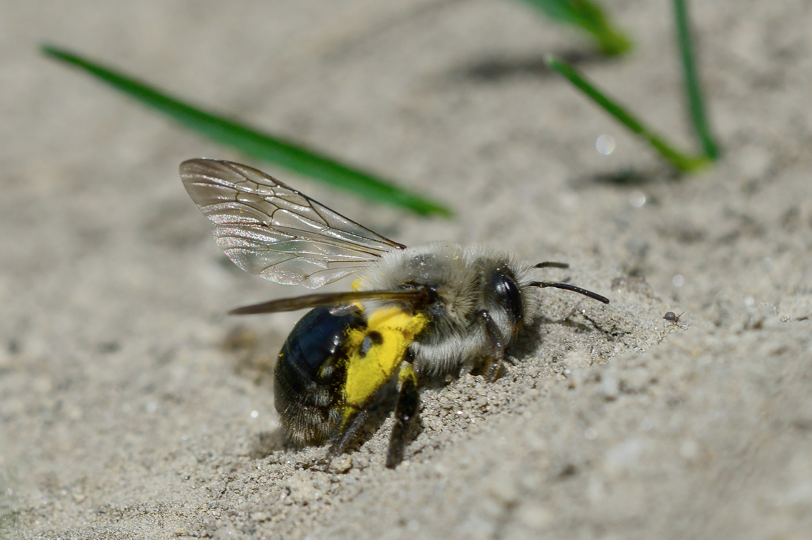 Die Weidensandbiene, Andrena vaga, ist eine der ersten im Frühjahr aktiven Arten und oft in großen Gruppen in Flussauen, sandigen Gärten und Parks zu finden. Sie nistet im Boden und sammelt Pollen fast ausschließlich von Weiden. © Wolfgang Schruf