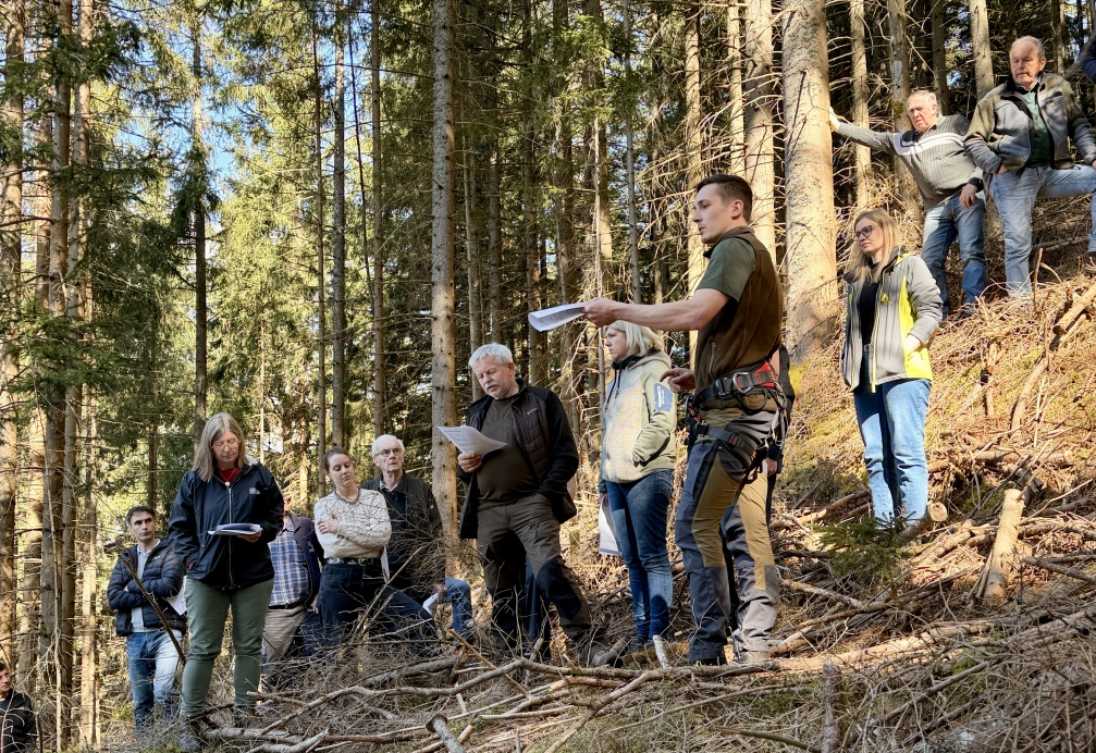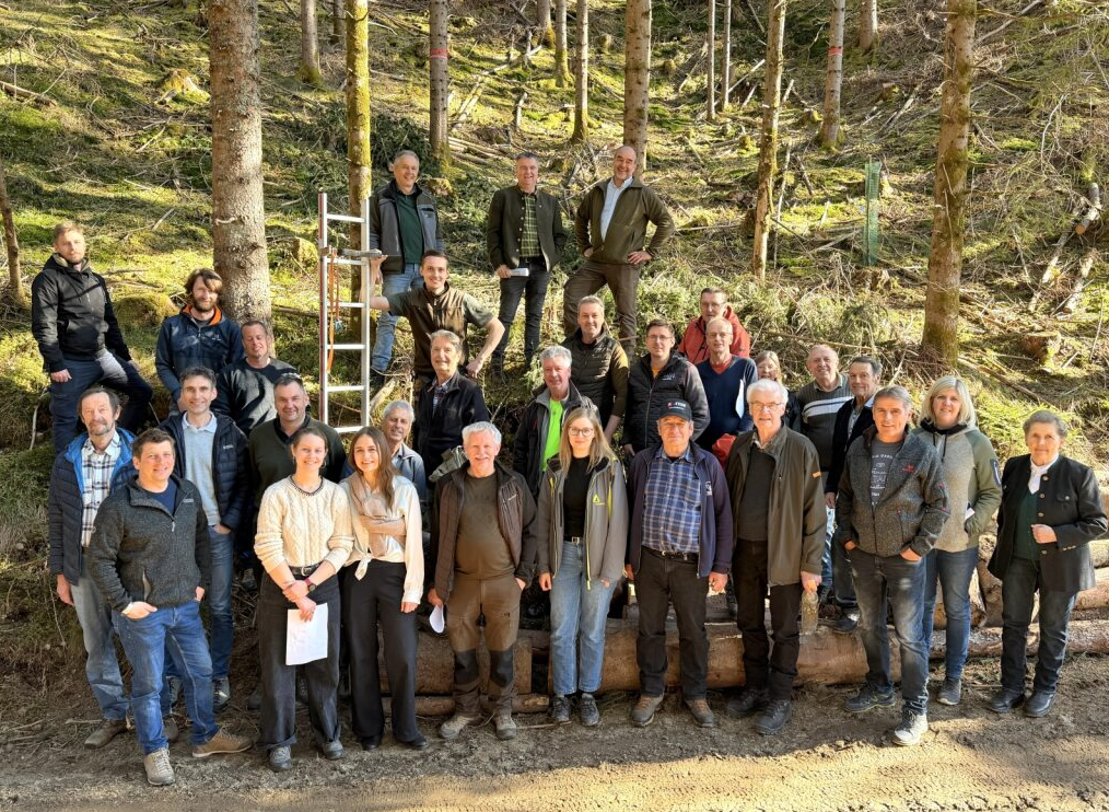 Auch der zweite Aktionstag bot eine Exkursion: Am Betrieb von Florian Hechenblaikner vulgo Grabner in Öblarn erhielten die Teilnehmenden praxisnahe Einblicke in die klimafitte Bewirtschaftung von Nadelholzbeständen.