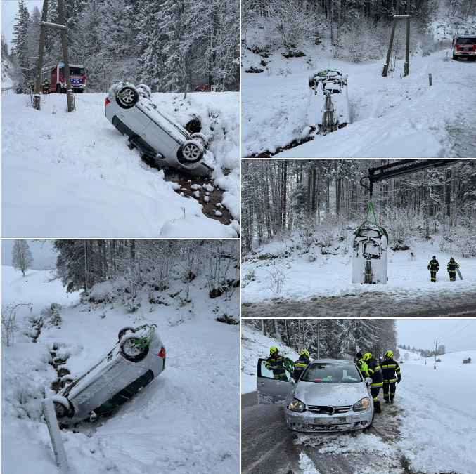 Ein PKW kam aufgrund winterlicher Fahrverhältnisse von der Strasse ab, überschlug sich und kam schließlich auf dem Dach in einem Bachbett zum Stillstand. Wie durch ein Wunder wurde dabei niemand verletzt.