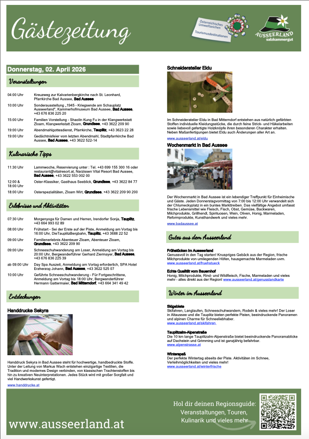 Der Wochenmarkt in Bad Aussee ist ein lebendiger Treffpunkt für Einheimische und Gäste. Jeden Donnerstagvormittag von 7:00 bis 12:00 Uhr verwandelt sich der Chlumeckyplatz in ein buntes Markttreiben. Das vielfältige Angebot umfasst frische Lebensmittel wie Fleisch, Fisch, Obst, Gemüse, Backwaren, Milchprodukte, Grillhendl, Spirituosen, Wein, Oliven, Honig, Marmeladen, Reformprodukte, Kunsthandwerk und vieles mehr.