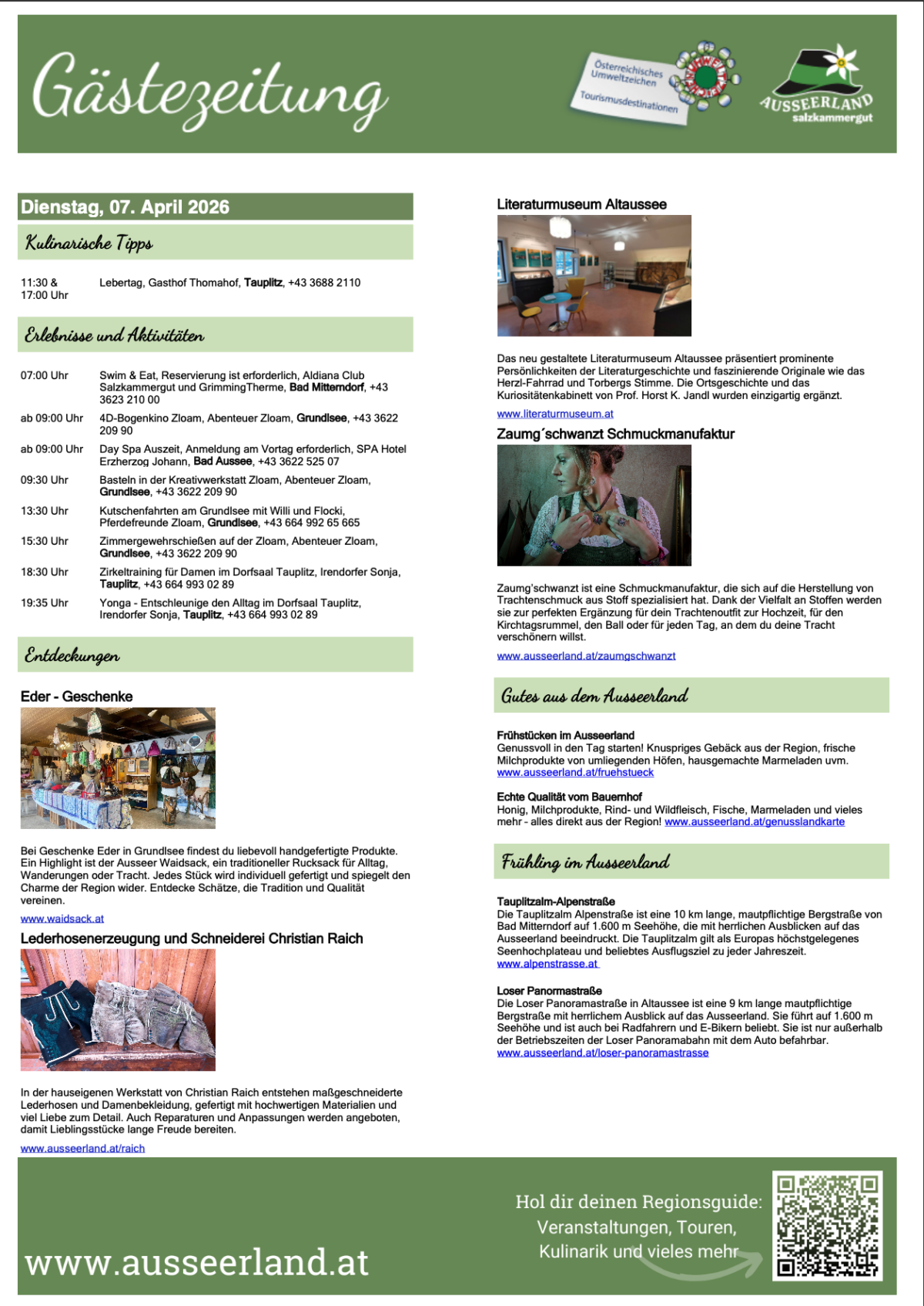 Gästezeitung des TVB Ausseerland Salzkammergut für Dienstag, 07. April 2026