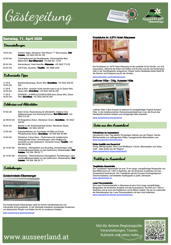 Gästezeitung des TVB Ausseerland Salzkammergut für Samstag, 11. April 2026 Von Markus Raich | Veröffentlicht am 10. April 202610. April 2026 Leithner Hüte in Bad Aussee ist bekannt für handgefertigte Original Ausseer Hüte. In der traditionsreichen Hutmacherwerkstatt kann man die Kunst des Handwerks hautnah erleben und einzigartige Hüte erwerben. www.ausseerland.at/ausseerhut