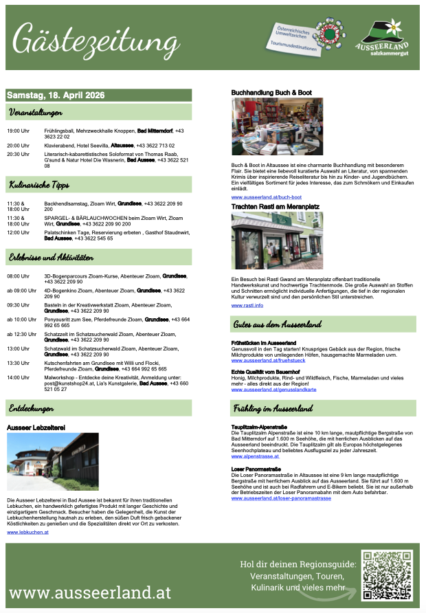 Gästezeitung des TVB Ausseerland Salzkammergut für Samstag, 18. April 2026